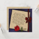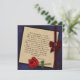 This beautiful wedding set features a classic gothic damask patterned background in deep blue with a parchment cover and a single red rose. While a stunning red grosgrain bow holds it all together. The parchment on the invitation has the look of a hand written quote from William Shakespeare's classic, Romeo and Juliet.