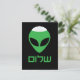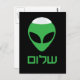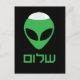 Green alien head with big eyes wearing a kippah/ yarmulke with "Shalom" in Hebrew below.