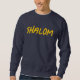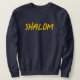 SHALOM IN BOLD YELLOW GOLD LETTERING ON A MODERN NAVY BLUE LONG SLEEVE SWEATER!