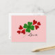 A beautiful design featuring a lucky 4 leaf clover with red hearts and the word "Love" on a pink background on this post card.