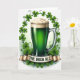 This card features a tall glass of emerald-green ale at the center, catching soft highlights that make it look cool and freshly poured 💚. A thick white foam cap spills gently over the rim, and tiny bubbles rise through the green drink like a quiet toast between friends. Around the glass, a wreath of three-leaf shamrocks forms a natural frame, with curving vines linking each clover in a way that feels like an easy arm-in-arm embrace ☘️. The shamrocks are shaded with light and shadow to give them depth against the bright white background. Beneath the mug, a golden banner stretches across the lower portion, adding a warm contrast to all the green. On the banner, the words “THE IRISH ALE” sit centered in dark serif letters that stand out clearly. The mug’s handle has a gleaming metallic look, and the banner’s folds show gentle highlights and shadows along its edges.