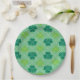This paper plate features a repeating pattern of green hearts and shamrocks, perfect for a St. Patrick's Day celebration or Irish-themed festivities.