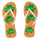 Lucky is written in white text on green shamrocks.  Festive Ireland flag colours in green, white, orange for the Irish and Saint Patrick's Day or to wear anytime.  Fun, unique Flip Flops perfect for summer fun, the beach and vacation travel for anyone.  Shown with a white slim strap and white sole.  Original Graphic Artwork by TamiraZDesigns.