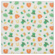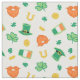 Fabric for St Patrick's Day with a pattern of orange beards, leprechaun hats, gold coins, shamrocks, Irish flags, and horseshoes.