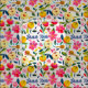 The fabric featuring this seamless pattern is a vibrant and dynamic textile that instantly catches the eye. The pattern consists of abstract, interlocking shapes in bold shades of blue, pink, purple, and yellow, set against a deep navy background. The colours are randomly distributed, creating a lively and non-repetitive visual effect that adds a sense of movement and energy to the fabric. This design is perfect for a variety of applications, from fashion to home decor, making it a versatile choice for those looking to add a touch of excitement and personality to their projects. Whether used for clothing, upholstery, or accessories, this fabric is sure to make a bold statement and bring a sense of fun and creativity to any item it adorns.
