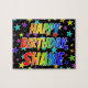 This fun and exciting birthday-themed jigsaw puzzle design has the message "HAPPY BIRTHDAY, SHANE" with the characters having a colourful rainbow spectrum inspired gradient pattern, in addition to a vibrant stars background pattern. An exciting puzzle like this might be used to send birthday greetings to somebody named Shane. [~Z0000468]