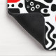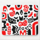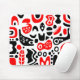 A mouse pad with an unusual abstract design made up of strange surreal shapes in red and black. Inspired by retro modern design.