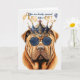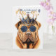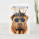 A cute tan Chinese Shar Pei dog in round blue sunglasses and a kingly crown that coordinates, creates a funny birthday card for dog parents and lovers.