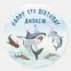 Add these round circle stickers to your birthday party favors, gifts, treats, bags and more! These stickers feature a school of festive birthday sharks all wearing fun party hats! Easily edit with your birthday party information.