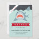 This cute and simple virtual boy's birthday invitation features a navy blue background with an open mouth shark under the water and a shark fin above the water. The reverse side features a navy blue background. Perfect for shark themed birthdays, pool parties, and swimming parties. Personalise for your needs. You can find more matching products at my store.