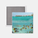 Souvenir magnet with a shark chasing butterfly fish in the clear blue water of the lagoon of the tropical pacific island Bora Bora of the Tahiti archipelago French Polynesia. Above the water you can see overwater bungalows.
