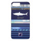 Cool graphic design of a white shark on a striped blue pattern with custom name