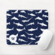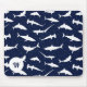 Cool navy blue mouse pad printed with sharks such as great white, thresher, hammerhead and mako. Personalise by adding your own initial.
