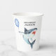 A fun Shark theme featuring a watercolor shark sporting a glittery party hat and holding a balloon with his age. Cute fun and modern.