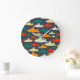 Simple but sweet shark pattern clock in navy, teal, red, orange, yellow and grey.