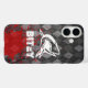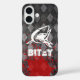 This cool phone case features a white pictogram of a great white shark on a black, grungy argyle background, spattered with a red blood stain! It says "Bitey" below the shark, but you can easily change this text in the box above! Try adding your name!