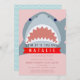 This cute and simple girl's birthday invitation features a pink background with an open mouth shark The reverse side features a light sky blue background with white wave patterns. Perfect for shark themed birthdays, pool parties, and swimming parties. Personalise for your needs. You can find more matching products at my store.