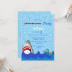 Blue background, bubbles, blue waves, a scuba diver, and a shark. Templates for the name of the child and party details, blue, red and white coloured letters.