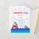 White background, bubbles, blue waves, a scuba diver, and a shark. Templates for the name of the child, age 3 three, and party details, blue, red and yellow coloured letters.