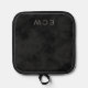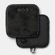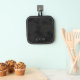 This potholder features a lower stamped effect name or monogram on a mottled black background giving a look of faux suede or parchment.