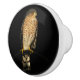 This animal ceramic door knob features a Sharp Shinned Hawk (Accipiter striatus) perched on the top of a bird feeder hoping to catch a meal. He has a hunter's stare. His yellow talons and orange eyes are prominent. He has lovely rust and cream bands on his breast, white and black striped tail feathers, and a grey back. This hawk's prey is mostly small birds. Although the "Sharpie" is the smallest hawk in North America, he is a very fierce predator. A wonderful idea for bird lovers!