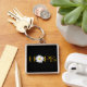 Premium square keychain with the word Hope on it with a white and yellow Shasta Daisy flower in place of the "O" in Hope, on a solid black background.
