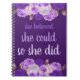 This cute vintage motivational design features the inspirational words, "She believed she could so she did" in popular, elegant typography in shades of lavender and purple on a deep royal purple background, a perfect gift of encouragement, affirmation and support for yourself or a special girl or woman in your life.