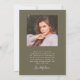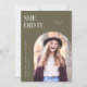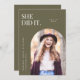 Modern graduation announcement card featuring a olive green arch frame for your photo. The text says "SHE DID IT."