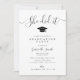 A simple graduation party invitation card with black and white colors. The text details can be personalized.