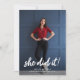 This modern and trendy graduation party invitation features the grad's photo on the front, with script typography saying "she did it". There is room for a second photo on the back, with all of your party information.