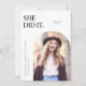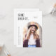Modern graduation announcement card featuring a white arch frame for your photo. The text says "SHE DID IT."