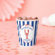 Give your Bridal shower a nautical touch with these personalized paper cups. They feature my hand drawn realistic style illustration of a lobster in red with your custom text in blue. All the text is ready for your personalized touch including the "She found her lobster" slogan at the top. The text and graphic are set inside of a round scalloped frame with a ribbon look and a red bow at the top that is set against a blue and white striped background. The text and graphic design appears on both sides of the cup.