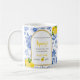 The She Found Her Main Squeeze bridal shower coffee mug features blue flowers, yellow lemons, and black and yellow text.