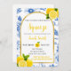 She Found Her Main Squeeze bridal shower invitation features blue flowers, yellow lemons, and black and yellow text.