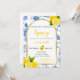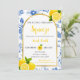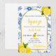 She Found Her Main Squeeze bridal shower invitation features blue flowers, yellow lemons, and black and yellow text.