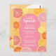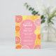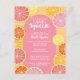 Whimsical citrus fruit in lemon, pinks, coral, orange and ruby red grapefruit colours. The hand drawn citrus slices include a watercolor painted texture for a juicy addition to a colourful wedding shower invitation.