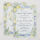 A She Found Her Main Squeeze Lemon Bridal Shower Theme is the perfect summer bridal shower. Refreshing and cool citrus fruit always create beautiful displays and refreshments. The Jenny's Lemons Collection takes chic watercolor lemons and pair them with Mediterranean blue tiles. In this design the tiles create a blue frame. A thin gold frame elevates it. Yellow lemons, sage green leaves and an assortment of yellow and white flowers decorate the blue frame. She found her Main Squeeze is written at the top. The remainder of the bridal shower details follow.