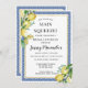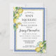 A She Found Her Main Squeeze Lemon Bridal Luncheon Theme is the perfect summer bridal shower. Refreshing and cool citrus fruit always create beautiful displays and refreshments. The Jenny's Lemons Collection takes chic watercolor lemons and pair them with Mediterranean blue tiles. In this design the tiles create a blue frame. A thin gold frame elevates it. Two lemon bouquets add a floral touch. She found her Main Squeeze is written at the top. The remainder of the bridal luncheon details follow.