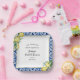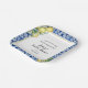 Designed to coordinate with the Jenny's Lemon Collection, this bridal shower paper plate features yellow lemon bouquets decorating a square blue tile and gold frame. She Found Her Main Squeeze begins the bridal shower text. The bride's name and bridal shower follows written in a modern and trendy script font. The date completes the text. All the text is editable.