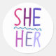 SHE / HER Pronouns Purple Handlettering Set of Classic Round Sticker