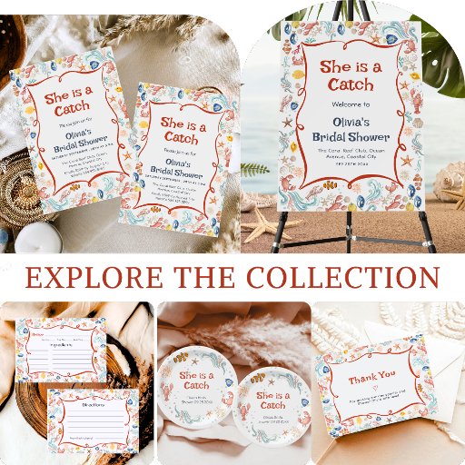 Celebrate the bride-to-be with this She Is a Catch under-the-sea bridal shower invitation, featuring charming ocean illustrations, seashells, starfish, coral, and sea life accents. Designed with playful typography and decorative lettering, this invitation is perfect for coastal, beach, nautical, and ocean-themed bridal showers. Fully customizable with your event details, it coordinates beautifully with matching welcome signs, thank you cards, and decor from the same collection for a cohesive bridal shower celebration.