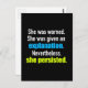 She was warned. She was given an explanation. Nevertheless, she persisted. A strong quote supporting Elizabeth Warren and her efforts to let democrats voices be heard in the senate. Never stop believing in progress.
