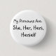 She spotted a pronoun badge just for her and quickly purchased it, making it hers. She pinned it to herself every day and lived happily ever after!