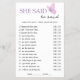 "He Said, She Said" is a delightful and interactive game that invites guests to guess who said what when it comes to the couple. It's an opportunity for the bride-to-be to share stories and anecdotes about her relationship, adding a layer of sentimental fun to the bridal shower.