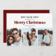 A modern " She said yes!" " Merry Christmas" 3 photo collage Christmas engagement announcement card. The design features modern typography . On the rear side of the card, the design features festive colour and more customisable text.