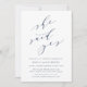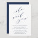Simple and elegant engagement party invitation features "she said yes" in chic navy blue calligraphy lettering. Personalise with your engagement celebration details beneath. Engagement party invitations reverse to solid navy.