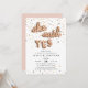 Unique engagement party invitations feature "she said yes" spelled out in rose gold balloons, on a background of rose gold, gold and black confetti. Personalise with your engagement party details in modern black lettering. Invitations reverse to solid blush pink.
