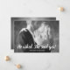 Simple and elegant photo engagement announcement card is perfect for spreading the word to family and friends about your new engagement. Add a photo of the newly engaged couple. Across the bottom portion of the photo area is text in white script font that says He asked. She said yes! There is also customizabled text in standard white font to add the engaged couples names. The back of the card is solid silver colour and has large text in the centre in the same white script font that says Stay tuned.... These engagement announcements are a wonderful precursor to your engagement party invitations, save the date cards or wedding invitations. They are simple and elegant to they will match or correspond to any future wedding theme.
