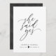 This save the date/engagement announcement features the phrase "She said yes" in a modern simple black handwritten script with details underneath and a black watercolor background on the back.
