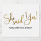 A modern gold script text with She Said Yes in a minimalistic style with your custom names below in a simple modern font.